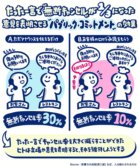 人は立場や意思を表明すると、それを維持しようとする心理が働く。たった一言お客さまの口から承諾をもらうことでキャンセル率が激減。その効果もスゴイが、対峙して争わない穏やかな接客ができることが素晴らしい対策。お店やサービスにおける事業の基本理念に立ち返り、この事例をヒントにさらなる改善ができるとイイですね。