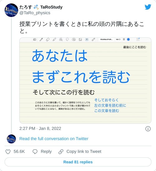 授業プリントのレイアウト 投稿日: 2022-01-122022-01-12 投稿者: jsaito 授業プリントを書くときに私の頭の片隅にあること。 引用元:https://mnky.tumblr.com/post/673092711899906048