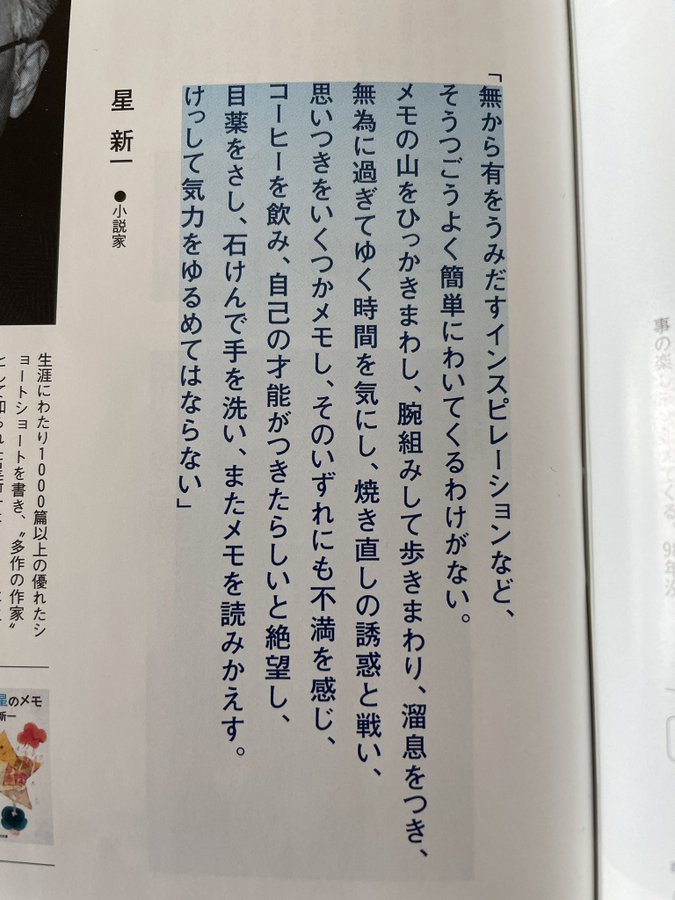 無から有をうみだすインスピレーションなど、そうつごうよく簡単にわいてくるわけではない。メモの山を引っかきまわし、腕組みして歩き回り、溜息をつき、無為に過ぎていく時間を気にし、焼き直しの誘惑と戦い、思いつきをいくつかメモし、そのいずれにも不満を感じ、コーヒーを飲み、自己の才能がつきたらしいと絶望し、目薬をさし、石けんで手を洗い、またメモを読みかえす。決して気力をゆるめてはならない。