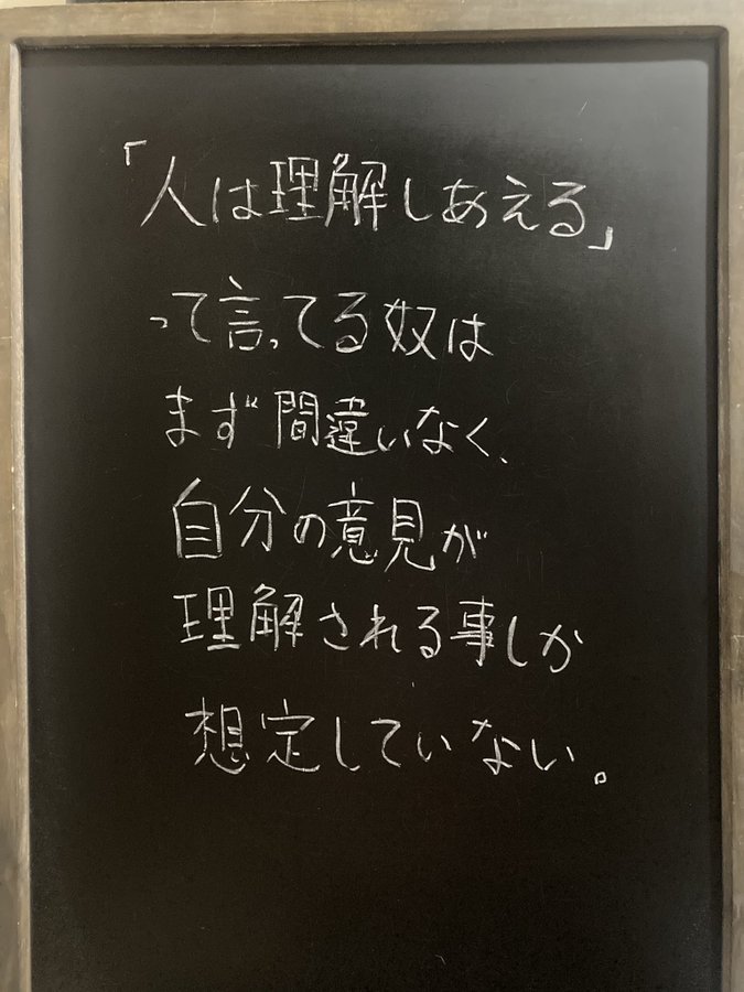 「人は理解しあえる」って言ってる奴は、まず間違いなく自分の意見が理解されることしか想定していない。 投稿日: 2024-05-192024-05-26 投稿者: jsaito 「人は理解しあえる」って言ってる奴は、まず間違いなく自分の意見が理解されることしか想定していない。 引用元:https://x.com/wb_opus_1/status/1791104592534757453