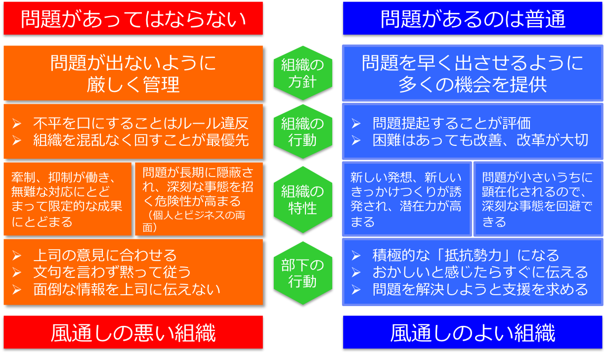 これに対して「風通しの良い組織」とは「問題があるのは普通」という考えが行動を支配しています。そのため、問題を早く出させるように多くの機会を作ろうします。そのために、問題をどんどん提起することを評価し、困難があっても改善、改革することを奨励するような雰囲気作りを努力するようになります。その結果、新しい発想、新しいきっかけ作りが誘発され、潜在力が引き出されるようになるのです。また、問題が小さい内に顕在化されるので、深刻な事態を回避することにもなります。