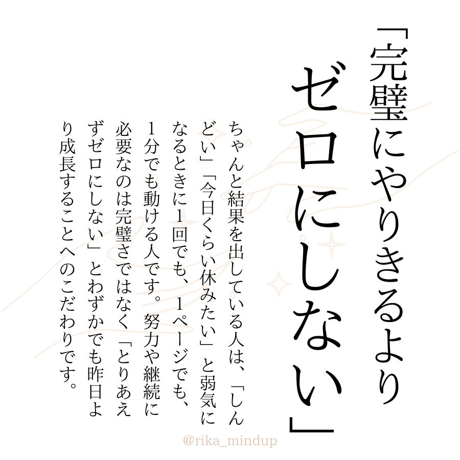 ちゃんと結果を出している人は「しんどい」「今日くらい休みたい」と弱気になるときに1回でも、1ページでも1分でも動ける人です。努力や継続に必要なのは完璧さではなく「とりあえずゼロにしない」とわずかでも昨日より成長することへのこだわりです。