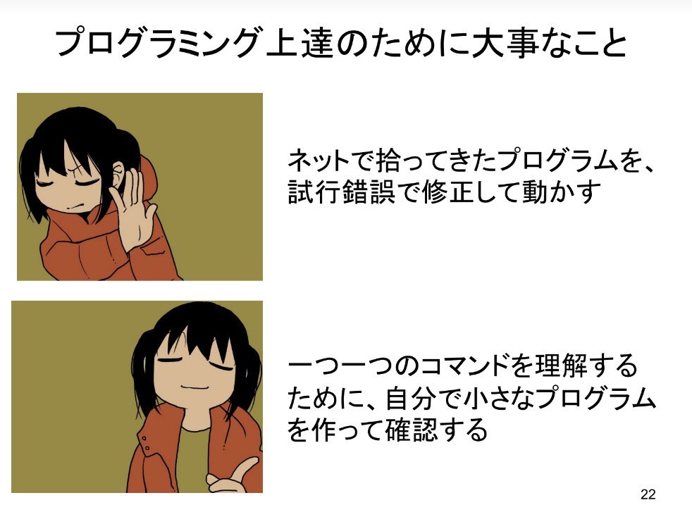 プログラミング上達のために大事なこと。一つ一つのコマンドを理解するために、自分で小さなプログラムを作って確認する 投稿日: 2024-08-082024-08-08 投稿者: jsaito プログラミング上達のために大事なこと 一つ一つのコマンドを理解するために、自分で小さなプログラムを作って確認する 引用元:https://x.com/s_kajita/status/1821096668819009933