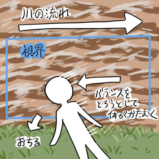 大雨で増水した川の近くに立つと視界が川の流れでいっぱいなり自分が流れと反対方向に移動してると錯覚して体が傾いて倒れて落ちるという図。大雨の時に川の様子を見に行っちゃだめだよ。