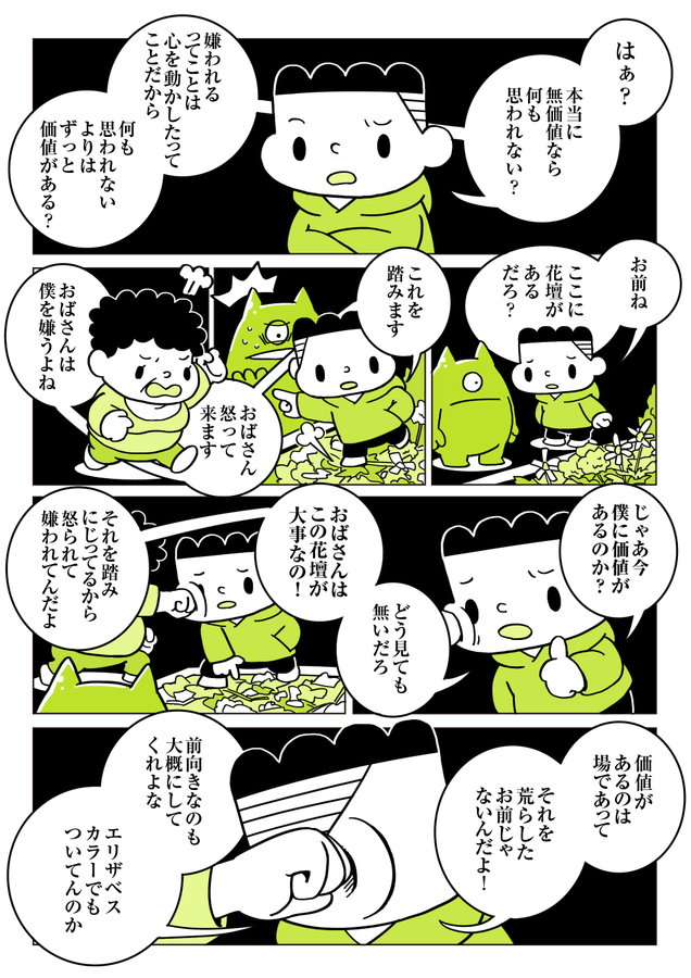 はぁ? 本当に無価値なら何も思われない?お前ね ここに花があるだろ?これを踏みます。おばさん怒って来ます。おばさんは僕を嫌うよね。嫌われるってことは心を動かしたってことだから何も思われないよりはずっと価値がある?おばさんこの花壇が大事なの!どう見ても無いだろ。じゃあ今僕に価値があるのか?価値があるのは場であってそれを荒らしたお前じゃないんだよ!。前向きなのも大概にしてくれよな。エリザベスカラーでもついてんのか