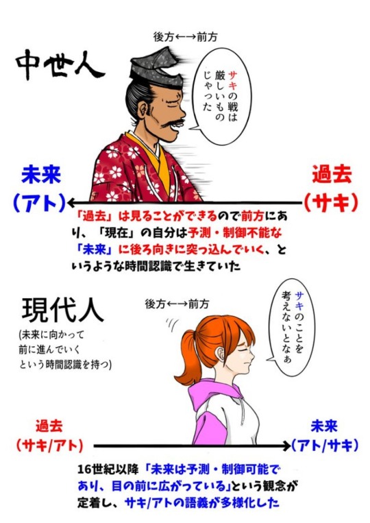 中世人 「過去」は見ることができるので前方にあり、「現在」の自分は予測・制御不能な「未来」に後ろ向きに突っ込んでいく、というような時間認識で生きていた。現代人(未来に向かって前に進んでいくという時間認識を持つ)