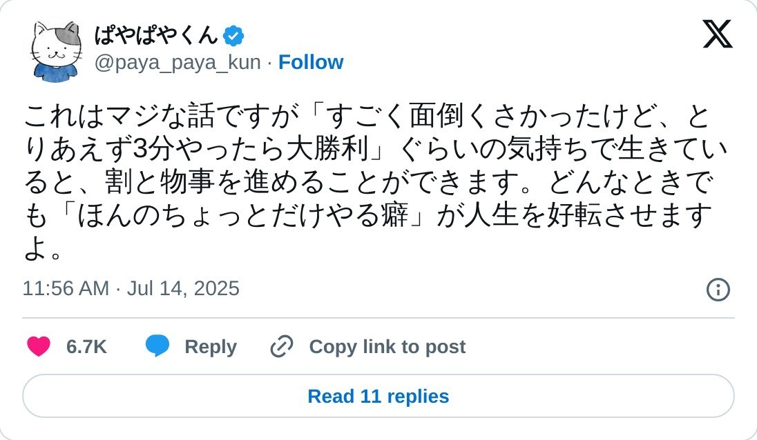 これはマジな話ですが「すごく面倒くさかったけど、とりあえず3分やったら大勝利」ぐらいの気持ちで生きていると、割と物事を進めることができます。どんなときでも「ほんのちょっとだけやる癖」が人生を好転させますよ。