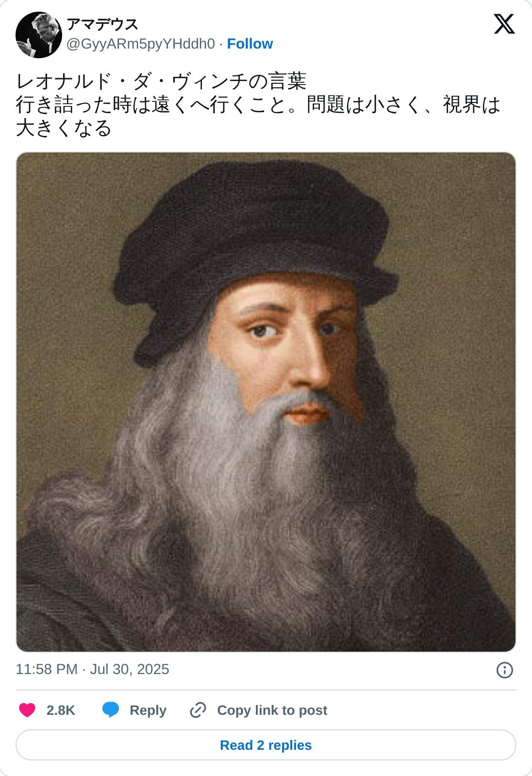 行き詰った時は遠くへ行くこと。問題は小さく、視界は大きくなる 投稿日: 2025-08-102025-08-11 投稿者: jsaito 行き詰った時は遠くへ行くこと。問題は小さく、視界は大きくなる 引用元:https://isssac.tumblr.com/post/790587070234116096