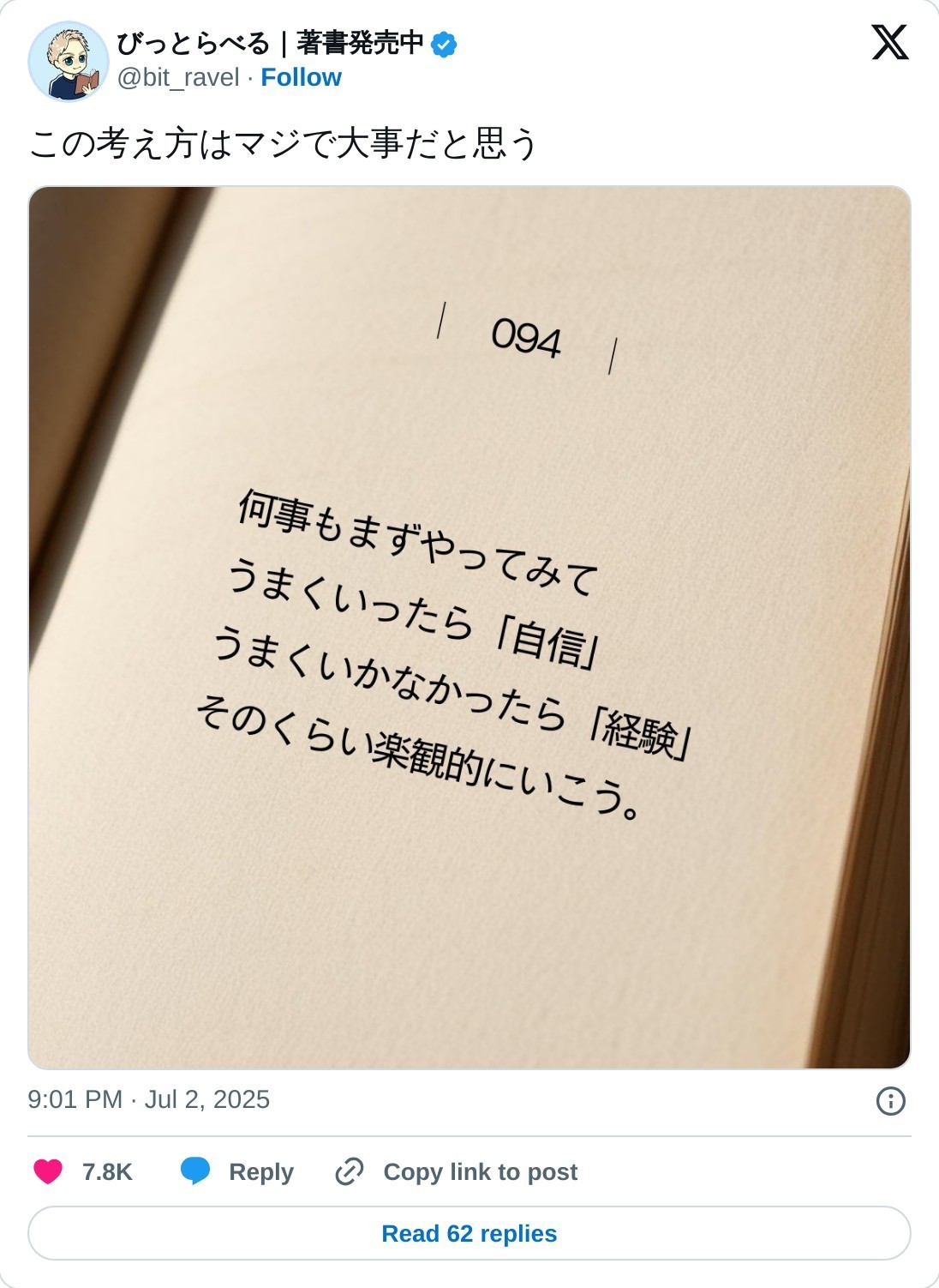 うまくいったら「自信」 うまくいかなかったら「経験」 そのくらい楽観的にいこう 投稿日: 2025-08-132025-08-14 投稿者: jsaito 何事もまずやってみて うまくいったら「自信」 うまくいかなかったら「経験」 そのくらい楽観的にいこう。 引用元:https://backy3723.tumblr.com/post/789365977051774976