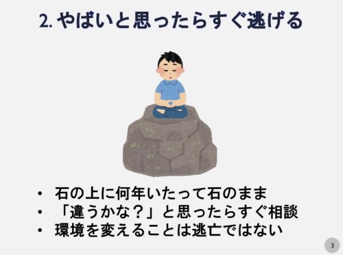 睡眠は大事、やばいと思ったらすぐ逃げる、わからなければすぐ質問、まず手を動かす