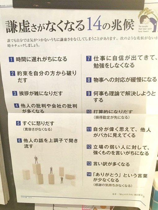 誰でも自分では気がつかないうちに謙虚さをなくしてしまうことがあります。次のような兆候がないか時々チェックしましょう。